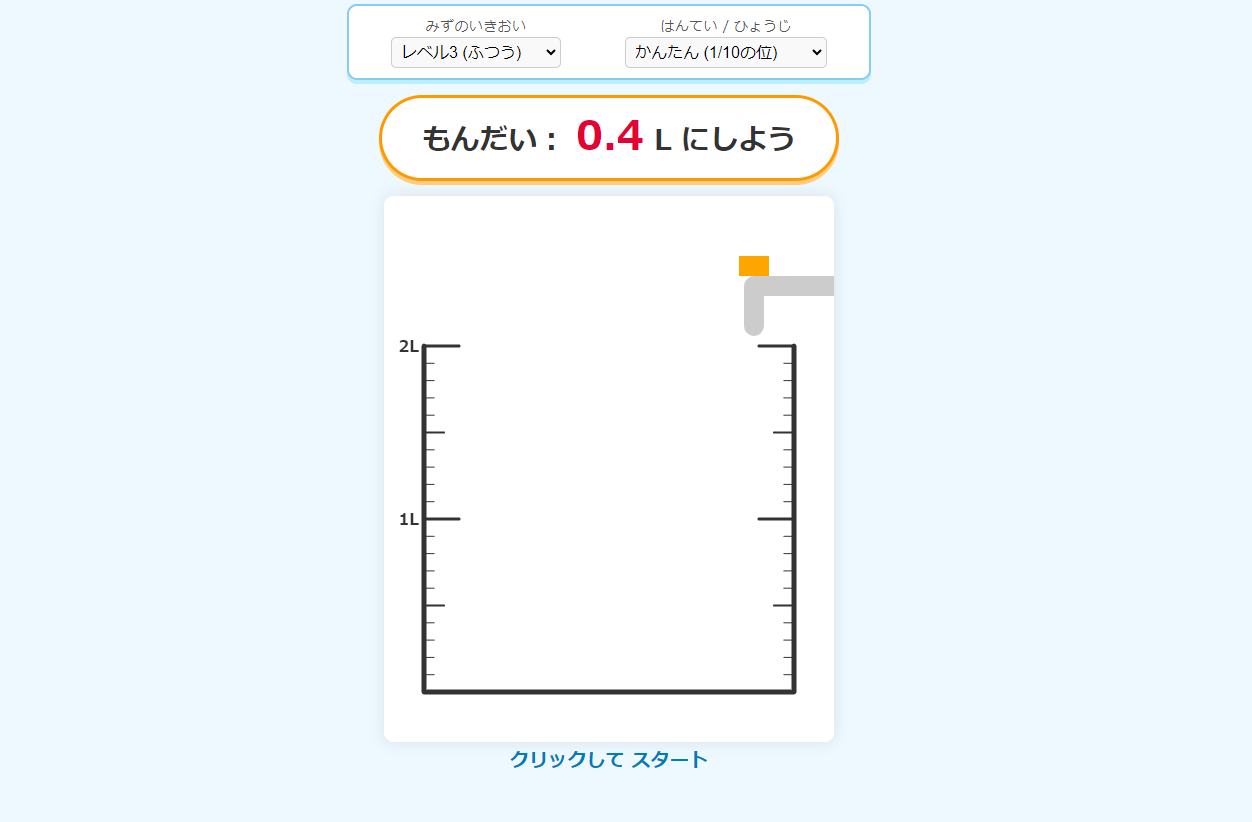授業の残り5分や、朝学習の時間などに、個別最適化されたドリルとして活用できます。 「かんたんモード」で大まかな感覚を掴んだら、「むずかしいモード(誤差なし)」に挑戦。何度も繰り返すことで、「あとこれくらい入れたら1L」という感覚が鋭くなります。